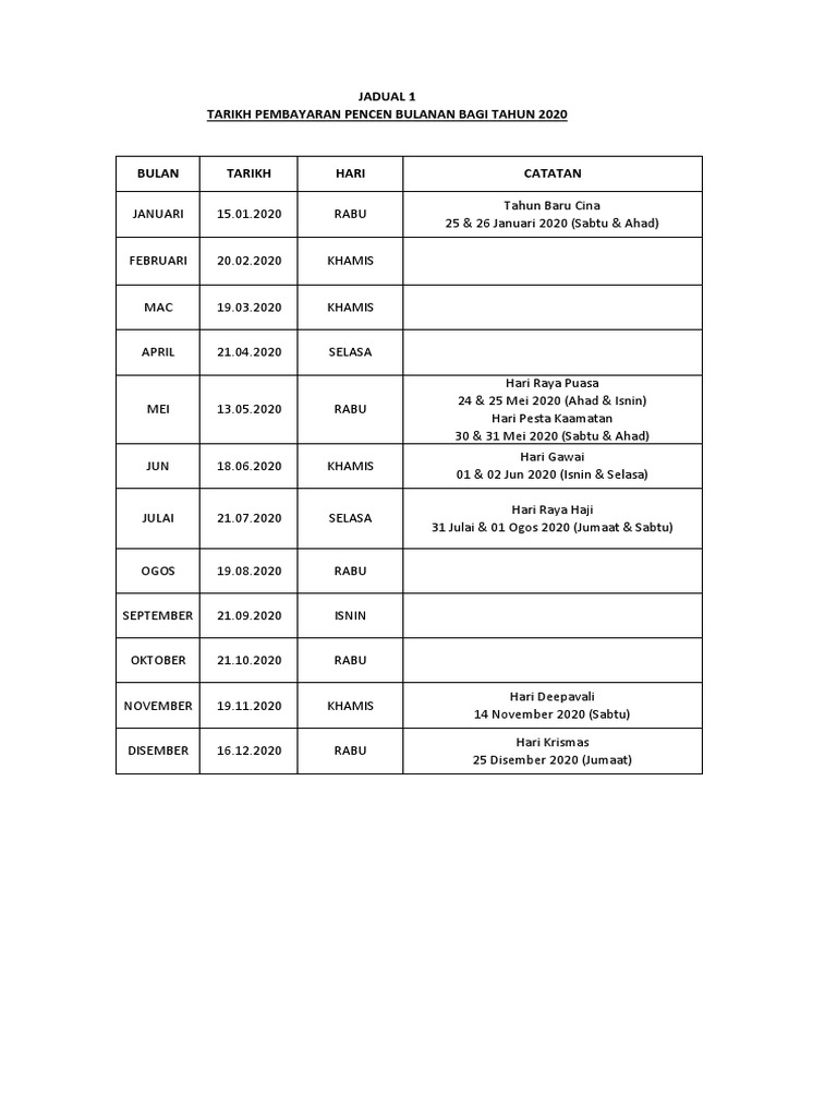 Jadual pembayaran pencen yang disertakan ini adalah rasmi. Tarikh bayaran duit pencen bulanan pesara kerajaan malaysia. Untuk maklumat terkini tentang tarikh bayaran pencen bulanan bagi tahun 2020, sila muat turun jadual bayaran pencen asal di sini. Tarikh 25hb tersebut jatuh pada hari jumaat, sabtu atau ahad. Jadual gaji pencen 2020 malaysia.